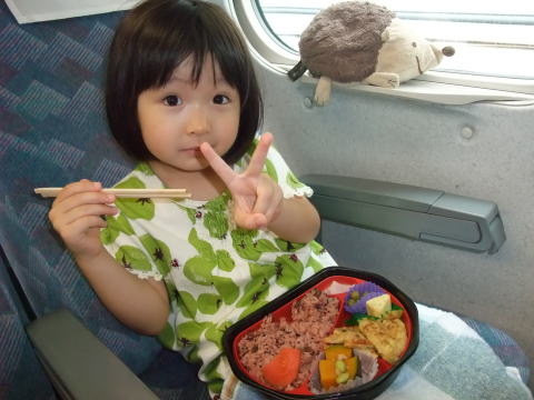 お昼の駅弁を買い、新幹線に乗り込みました。依亜もパパも駅弁を早速広げてご機嫌♪