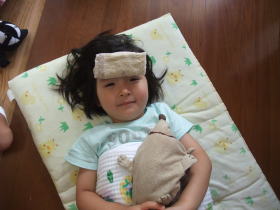 |  |  朝になっても依亜の熱は38度で下がらず。ママは午前中、産院へ行く予定があり、急遽、パパが午前中に仕事を休んで、依亜をみていてくれました。依亜は熱だけで、痛いところもなく、食欲もあり、よく喋っていて元気。今日も蒸し暑い。