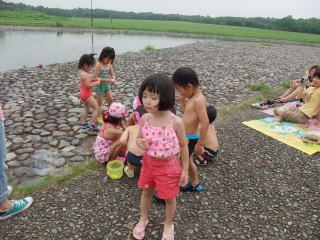 まだ咳も鼻水も出ているので、本人の希望もあり、マスクをして登園。今日の夏期保育も16名と少人数。