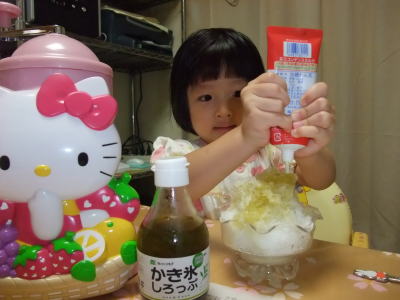 お夕飯後はかき氷、抹茶ミルク味をパパが作ってくれました。おいしかったです♪