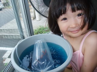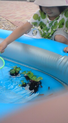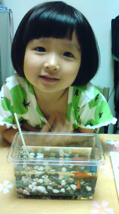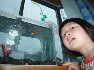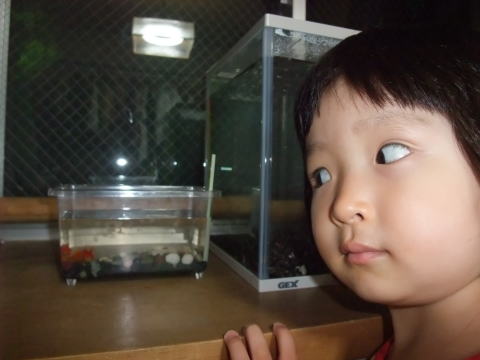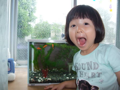 |  |  パパはあかちゃん(=金魚たち)のことが気になり、7時前に起きたのでビックリ(いつもはママが起こさないと起きない)。依亜も「金魚ちゃん、どう?」と起床。パパは出勤前、あかちゃんを大きな水槽に移してくれました。