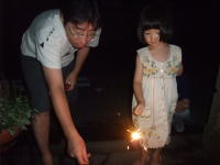 |  |  18時半から、つぼみ組の集い「花火大会」です。花火を持って、ユウタ君母子と一緒に集合場所の公園へ。チビッコ18人、ママ11人が集合し、寄せ集めの花火もたくさん集まりました。チビッコたちは、花火を楽しむだけでなく、暗い公園を走り回ったりもして、本当に元気いっぱいです。
