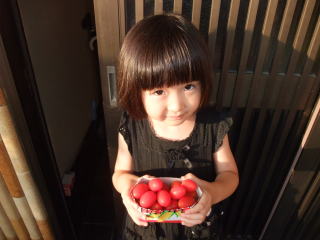 夕方、先ずはママババ実家のお墓へ行き、その後、ママ実家のお墓へ行きました。そして、シゲちゃんとスミちゃんのお家へ行き、ミニトマト収穫をしました。たくさんのミニトマトを収穫させていただき、依亜は早速お夕飯にいただきました。もぎたてもおいしいトマトでした。ごちそうさま〜。