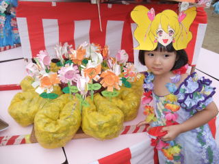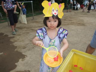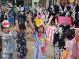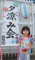 |  |  夏期保育五日目・夏祭りごっこ。体操服で登園です。今日は全園生徒集合の賑やかな幼稚園です。