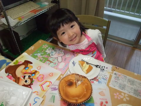 |  |  依亜が帰宅してから、一緒にチーズケーキを焼きました。ケーキ作りをするのは久しぶりのことでした。依亜は材料を一生懸命混ぜてくれ、2台のチーズケーキが完成しました。焼き上がって、冷めるまでまでずに食べた依亜。そう、依亜がチーズケーキを食べたのは初めてのことで(相変わらずケーキは食べません)、ほんの少しだけ食べました。生温かいチーズケーキ、冷やした方がミッチリしておいしいものですから、「よく冷やして、明日食べようね」となりました。