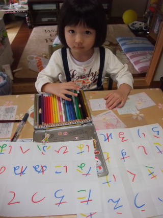 依亜は今、ひらがなを書けるよう頑張っています。目標は“来年1月、Y先生へバースディカードを作る”だそうです。お手紙が早く書けるよう、パパの作ってくれたひらがな表を見ながら、ひとりで練習する日々の依亜なのです。