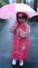 |  |  昨夜遅くから雨が降り出し、今日は一日雨で、時折、強く降りました。依亜の登園時、雨が強く降り出してきたのですが、かっぱと傘と長靴で頑張って歩きました。