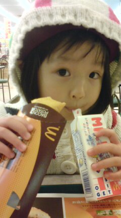 |  |  依亜をお迎えに行くと、担任のY先生より、「今日のお給食はナポリタンとサラダのお野菜どっさりで、依亜ちゃん、頑張って食べていたのですが、本当に少しだけだったので、お腹が空いていると思います」との報告。そこでママ、買い物の前に依亜をマクドナルドへ連れて行き、ベーコンポテトパイとミルクを食べさせました。
