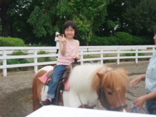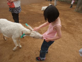動物とのふれあいでは、山羊に食べられた依亜。ポニーにも乗りました。
