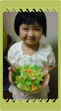 そして、お夕飯は依亜がお給食での人気メニュー“コーンサラダ”を作ってくれました。彩りもキレイで美味しいサラダでした。いっち、ありがとう。