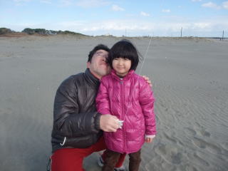 お昼前、三人で海へ。幼稚園でもらった“凧”をあげに行きました。適度な海風で凧はよくあがり、凧揚げ初の依亜はとても楽しんでいました。