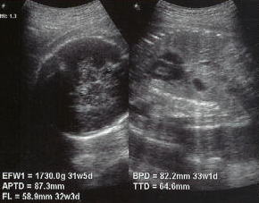 |  |  今日はモカちゃん、33週4日の健診です。今日は病院は空いていて、血圧測定と尿検査が終わると、すぐに健診となりました。モカちゃんの大きさは週数なりのようで、推定体重は1800g台、心臓もしっかり動いています。
