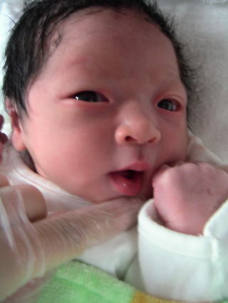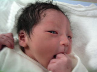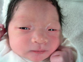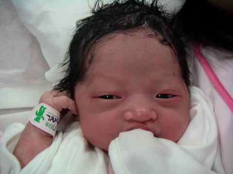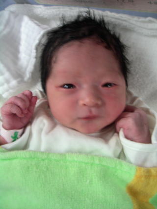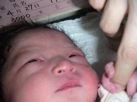 |  | 分娩室でのママの格闘は1時間以上でした、出てきてスグに大きな声で泣く事ができました。 キレイキレイして、ママの横にネンネしています。 (産まれて1時間後) |