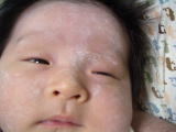 |  | シッカロールでお顔が真っ白。 ママがお風呂上りに全身パタパタしてくれるけど、お顔だけはゴホンゴホンになっちゃうから、ちょっとイヤだな〜。 |