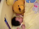 |  | 私のベッドには大きなプーさんがいるんだよ。素敵でしょう・・・ ・・・お店の赤ちゃんグッズ売り場で勝手に寝ていることは内緒だよ。 |