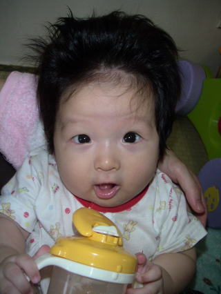 |  | 初めてストローでお水を飲んでみたの。 面白かったけど、吸うの疲れちゃったから、後でママにスプーンで飲ませてもらったよ。 でも、お水と果汁とオッパイのチャンポンしたから、いっぱい ゲー しちゃったの・・・ |