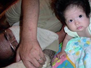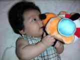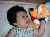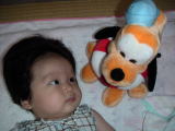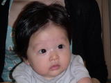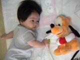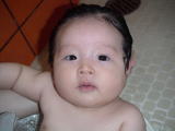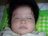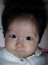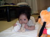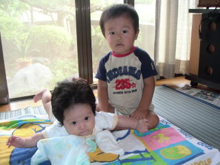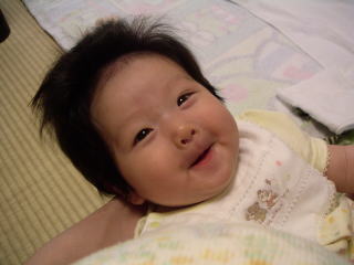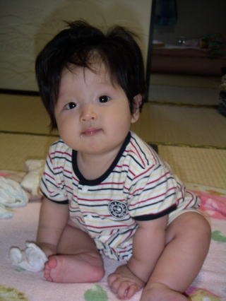 |  | (お座りしても倒れないようにバランスが取れるようになってきました) (この”イタズラっ子”顔がこれから先、とっても怖いパパとママです。) |