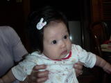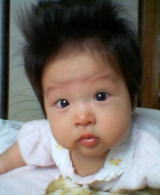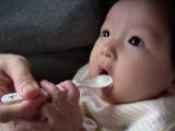 |  | 初めてオカユを食しました。 あ〜〜ん。モグモグ。 おいしいのね。 自分でスプーンを持って食べるから、ママの手助けは要らないよ〜! |