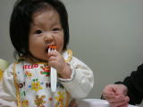 |  | パパ〜 ニンジンは、こうやって食べるのよ! とても美味しいから、パパにもあげるよ |