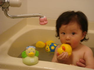 |  | お風呂の”友”をパクリッ みんなみんなパクッてしてあげるんです。これが私の愛情表現なの。 ついでに、このアヒルちゃんをパパにもお裾分けしてあげるわ!! (パパ : バクッ 苦しい・・・) |