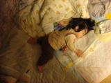 |  | (微熱でポカポカしてきたのか、夕飯もソコソコにして寝てしまった。今日はお風呂も入らずにオネムにします。) (でも、布団も掛けないで、こんな寝相してたら、具合は良くならないぞ!!) |