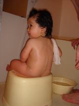 | 水を口に含んでガバーって 出すのが面白くて 何度も繰り返したら ビチャビチャになりました  | お洋服がぬれちゃったから、 風邪を引かないうちに、 ひと風呂、浴びるとするか!!  |