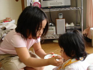 |  | <依亜チャン、あーん、 イチゴはおいしいでちゅか? いっぱい食べてお利口でちゅね> (従姉saeちゃんは、とってもお姉ちゃんしていて、依亜の面倒をよくみてくれます。二人とも、とーっても楽しそう。) |