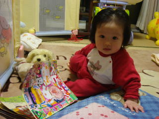 |  | これがウワサの”ベビーブック”480円です。 1〜3歳用だけど、私クラスのセレブには、少し物足りないくらいだわ。オホホホ (”おかあさんといっしょ””アンパンマン”などキャラクターの仕掛けやオマケが一杯付いていますが、全部見事に壊してくれました。トホホホ) |