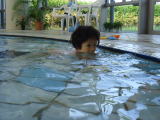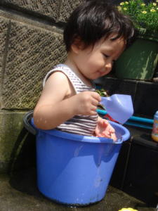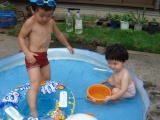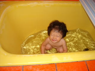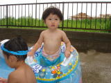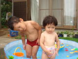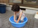 | 今日も暑いわ〜 ヨシヤ君、水遊びしましょうね。  チャプチャプ、楽しいわね〜 | あっ、こんなことしている場合じゃないわ  |