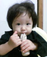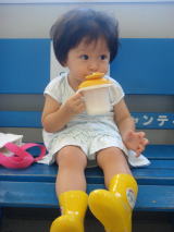 | ババに買ってもらったばかりの 黄色の長靴 雨でもないのに、履いちゃいます。 ちょっと疲れたから ベンチに腰掛けて 牛乳を飲んじゃいます。 |  | ||