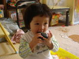 | いあっきゅうさん(一休さん)は、 タクハツに行って来ます。  | タクハツで頂いた大根をナイフで切り切り 生のままガブリッ ちょっと堅かった・・・  (風邪でお鼻が詰まって苦しそう・・・) |
