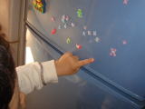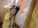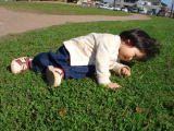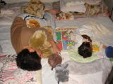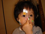 | ・・・ シールだらけ  犯人は誰だ。(この手は誰?!) | (あれ?犯人さんはオネムですか?)  (となりの大きな人も遊び疲れ?) (パパは働きなさーーーい!!) |