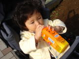| ママのお手伝い 布団たたきです。  | 一仕事終えた後は マイブームの「なっちゃん」 をグイッと飲むのです。  |