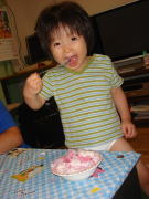 | カキ氷を作ります。 先日(7/30)は怪我をしてしまったので、 おとうさんにガリガリしてもらいます。  | うん、おいしい つめたくて、体も冷えるね。  |