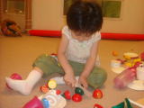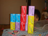| 体も冷えたところで、、、 ジュースを積み上げ、 いないいないばぁ遊びです。  | |