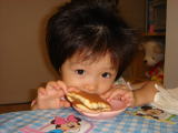 | おとうさんからのお土産 どら焼きをパクリ リンゴが入ってるよ |  |
