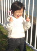 |  フー フー あれ?シャボン玉が飛ばないなぁ〜 | よし、走って飛ばしてみよう!  うわぁぁー | ||