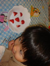 |  | ←目 ←鼻 ←ほっぺ ←口 イチゴでお顔を作ったけど わかりにくいかなぁ? | ||