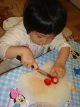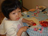 |  | 食べるだけではありません 切りますよ 包丁でイチゴちゃんをザクッと 切りますよ わたし真剣なんだから、 外野は静かにしててね | ||
