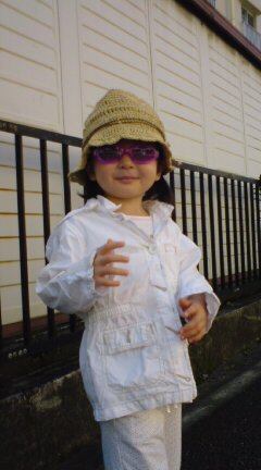 | そこゆくお方、私の正体がわかるかな? 真っ白な衣装にサングラス・・・月光仮面だと思ったでしょ?! さすがに私もそこまで古い人間じゃないわよ。 |  | ||||