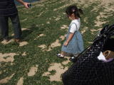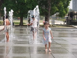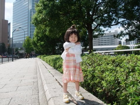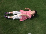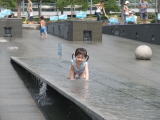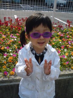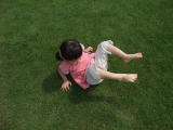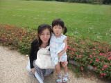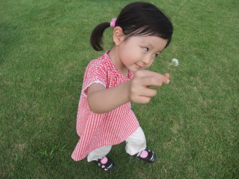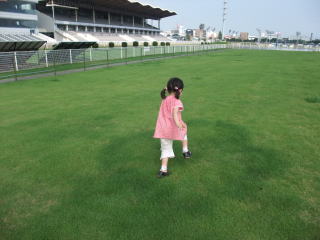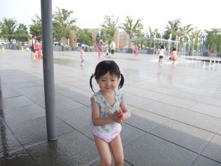| さて、次の目的地は お花がいっぱいあるところ。 もちろん、おねえちゃんも一緒だよ。  | お花より、 緑の芝生、 アスレチックより、 お水!  | ||||