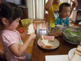 |  | 今日のお昼はサンドウィッチ・パーティ パンにバターをベッタリ。 ハムを挟んで〜 | ||||