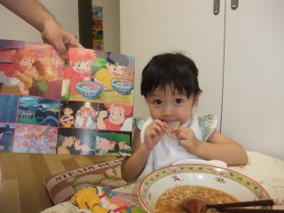 |  | 「崖の上のポニョ」という映画のポニョちゃんは、お魚だったのに女の子に変身したの。 大好物のハムが乗ったチキンラーメンに大興奮! 私もマネして、お昼ご飯をチキンラーメンにして、ハムを食べてみたよ。 ポニョみたいに真っ赤っかになれたかな? | ||||