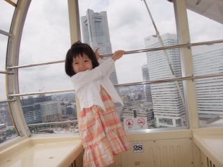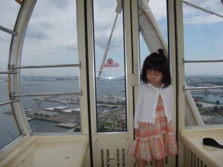| まずは、大きな観覧車。 あのビルより高く上るの?  | このドアがバンッて開いたら落っこちちゃうね ウフフフ、こんな高いところから落ちたら、きっと大変なことになっちゃうかしら  | ||||