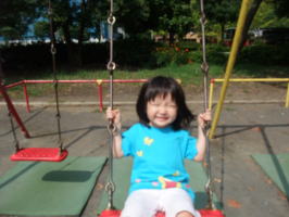| お姉ちゃんにもらった青空のようなシャツを着て、ピンクのリュックを背負って、ピクニックに行ってきます。  | このブランコで、お空まで 飛んでいっちゃいそうよ  | ||||