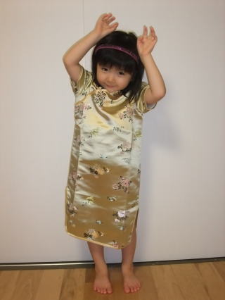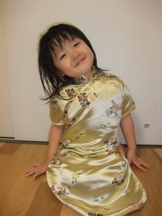 | ママババからのプレゼント 黄金色のチャイナドレスよ  | お月様みたいなキラキラしているね ピョンピョンうさぎさんのお衣装なのかしら?  |
