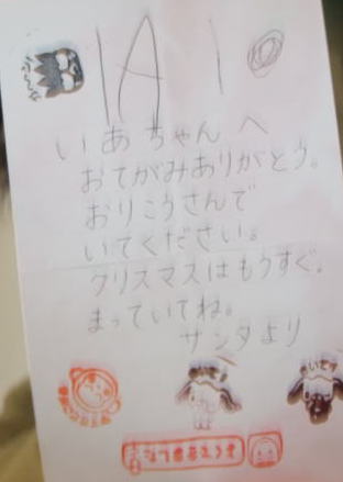 | いまさらですが。。。 クリスマスの前にサンタさんにお手紙書いたら、サンタさんから依亜にお手紙が届いたよ  |  依亜はお風呂からでたら、お顔にクリームを塗ってもらいます。つやつやピカピカのお顔になります。 | ||||||||||||