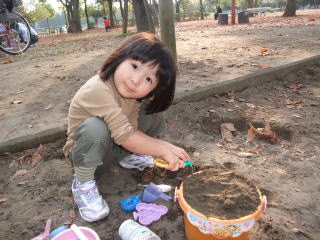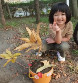 |  | バケツにお砂をイッパイ入れて 集めた色んな秋の葉っぱでデコレーション