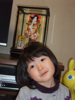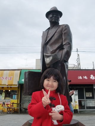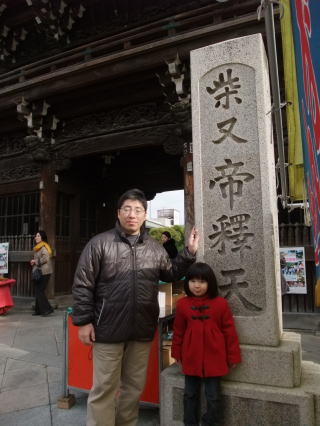 | 年賀状用の写真撮影のため、葛飾柴又というところにきました。 おとさん曰く「来年は寅年だけに、寅次郎」とのことですが、意味不明の依亜です。  |  おとさんは帝釈天というところで、蛾次郎という方を探しているようでしたが、本当に居るのかな? |