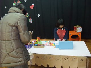| ドングリや枝で クリスマスのリースを作ったよ  | いらっしゃいませ〜 お菓子やさんですよ〜 アイス10個で10エンです 安いよ〜 キャンディーは1マンエンでーす!  |